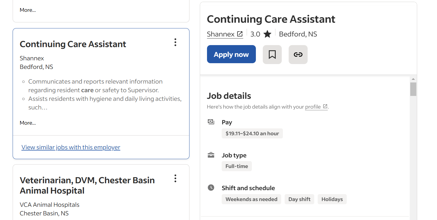 아래는 indeed 에서 CCA 직종을 검색해 봤습니다. 노바스코샤 주에서 이 명칭으로 검색한 구인광고입니다. Shannex라는 회사에 고용되어 일하는 shift 에 풀타임포지션입니다. 19~24 CAD의 시급을 제시하고 있네요. 낮근무이고 당연히 주말 휴일근무가 필요하다고 합니다.
